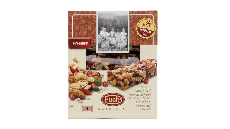 Fuchs Naturkost ai frutti rossi con arachidi e mandorle: 2,99 € per 4 barrette da 32 g l’una (23,36 €/kg).