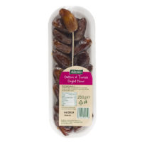 L’assaggio. Questi datteri freschi, venduti sfusi (motivo per cui non sono riportati i valori nutrizionali), non sono stati glassati con sciroppo di glucosio e non contengono conservanti. Sono di grandi dimensioni, regolari, con la superficie non troppo raggrinzita di colore scuro, tipico della pregiata varietà. All’assaggio soddisfano pienamente per la naturale dolcezza e la ricchezza aromatica. La consistenza è molto morbida, cremosa in bocca. Il prezzo è elevato, ma corretto.