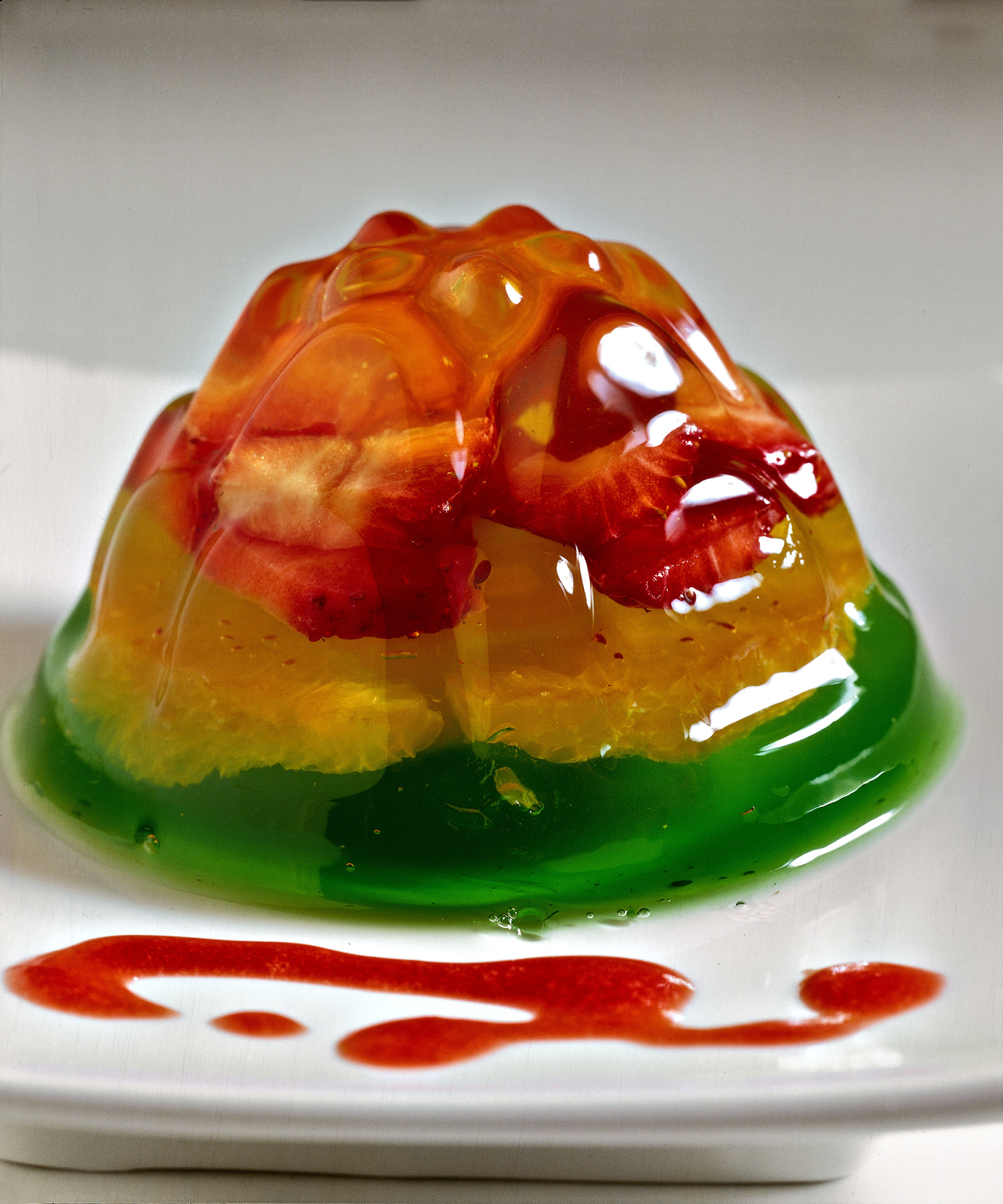 L’aspic canarino con fragole e agrumi piace ai grandi ma anche ai piccini che, incuriositi dai colori sgargianti, scoprono la bontà di un dessert fortunatamente ipocalorico