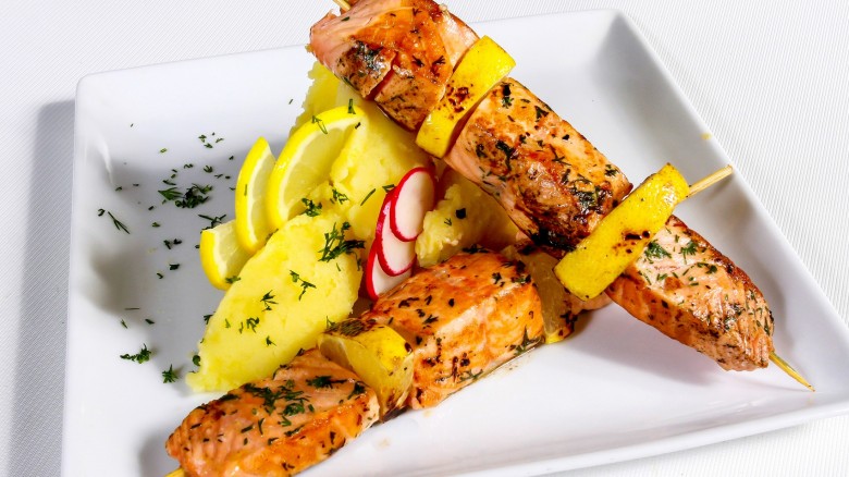 Spennella con olio e rosmarino i cubi di polenta e patate e infilali sugli spiedini alternandoli con quelli di pesce. Adagiali su una leccarda ricoperta di carta forno, spolverizzali con il pepe e falli cuocere a 200 °C finché risulteranno belli dorati. Servili tiepidi.