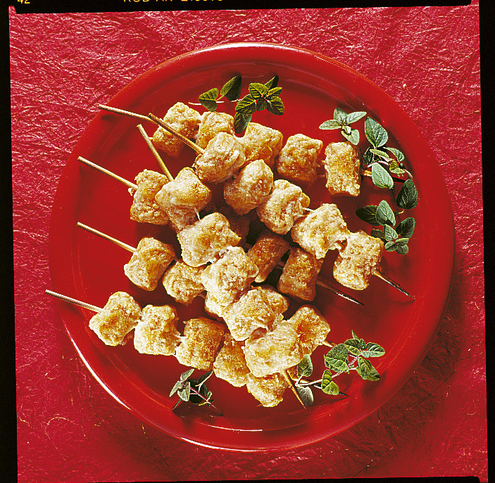 2) Ricava dall’impasto gli gnocchi e cuocili pochi per volta in acqua salata. Scolali e lasciali raffreddare leggermente. Forma gli stecchi infilando 4-5 gnocchi su ciascuno stecchino.
