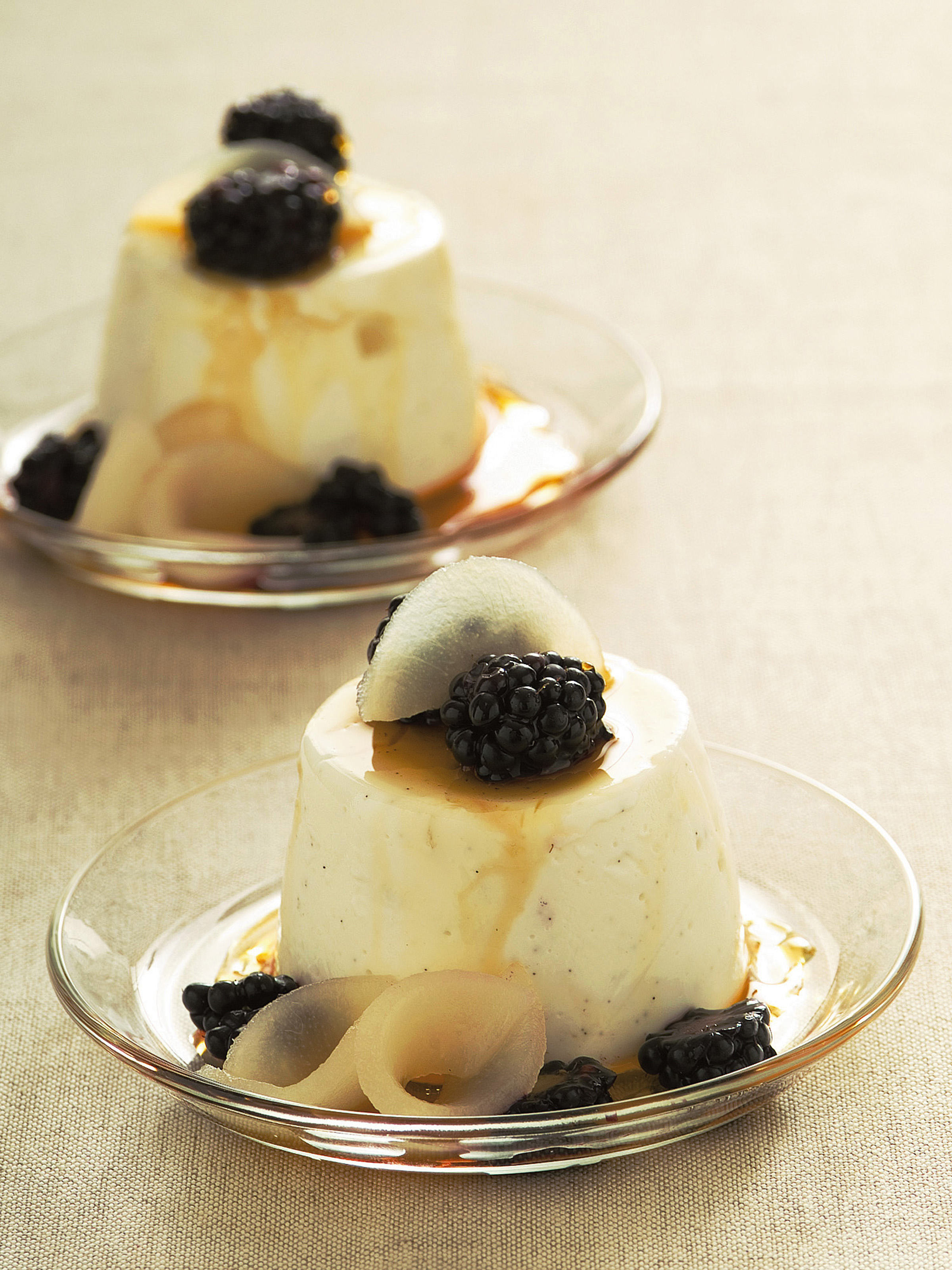 2) Poco prima di portarlo in tavola sforma ilbudino di yogurt e decoralo con le more fresche, il rimanente miele millefiori e qualche fettina di pera sciroppata.