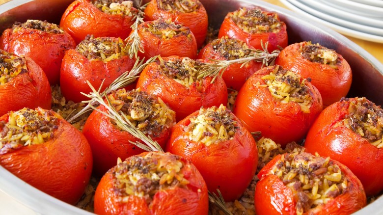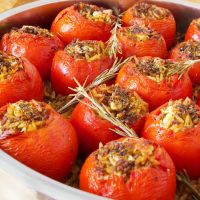 per 4 persone: 600 g di pomodori tondi e belli sodi, 500 g di cipolle bianche, 2 cucchiai di olio d’oliva, 2 rametti di timo, 2 rametti di rosmarino, sale e pepe