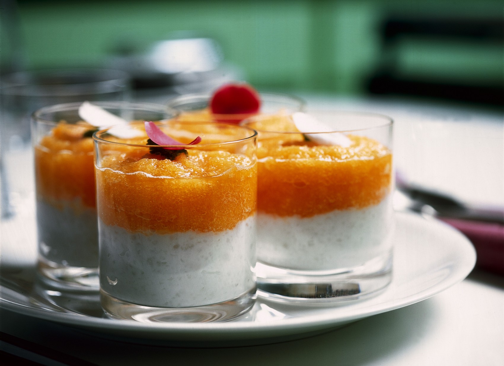 3) Ora non ti resta altro da fare che completare e servire le coppe di crema di riso e melone, quindi unisci lo yogurt bianco alla crema di riso ormai fredda e suddividila nelle coppette di vetro trasparente. Dopodiché aggiungi uno strato di frullato al melone e decora a piacere con qualche fettina o pezzetto di frutta fresca.