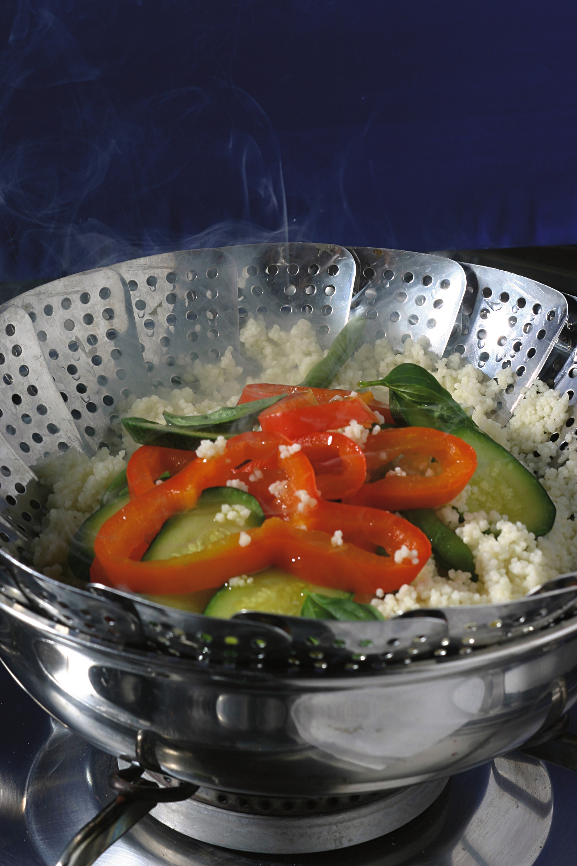 2) Nel frattempo dedicati alle verdure, quindi affetta la cipollina, taglia le zucchine a rondelle e riduci il peperone rosso a listarelle, poi cuocilo per primo a vapore e unisci le altre verdure solo quando la cottura del peperone sarà a buon punto. Fai lo stesso con il cuscus, quindi uniscilo alle verdure solo quando queste saranno quasi pronte.