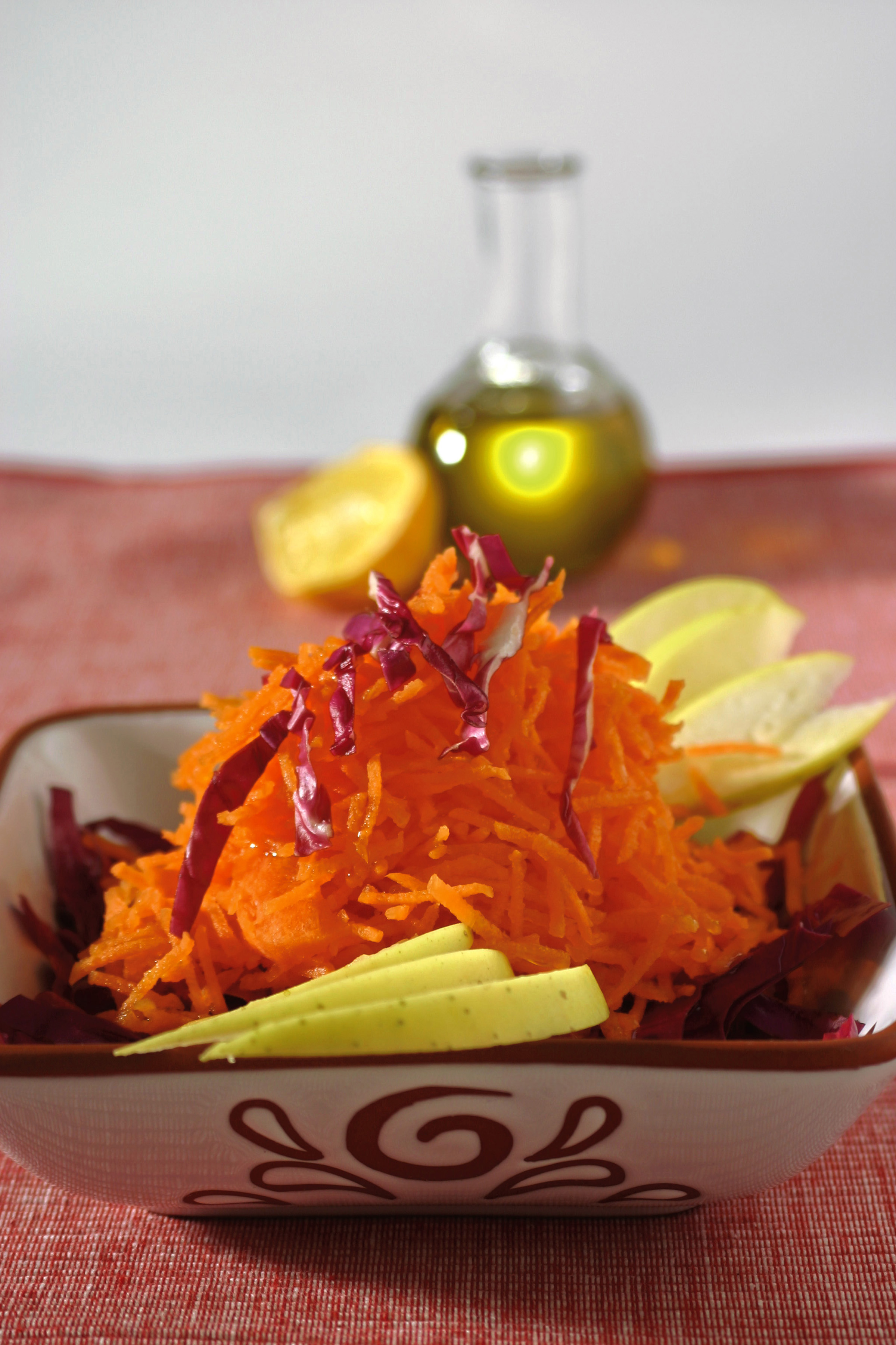 1) Per preparare la ricetta dell’insalata di carote, spella e grattugia le carote, poi taglia il radicchio a listarelle e metti tutto in un’insalatiera.