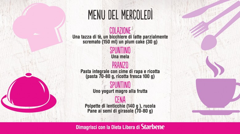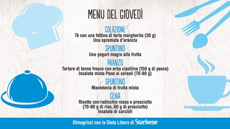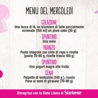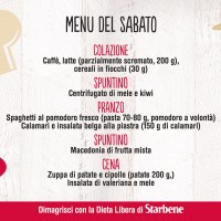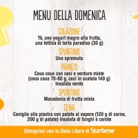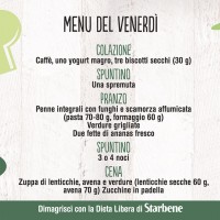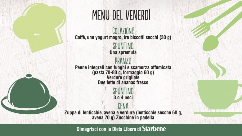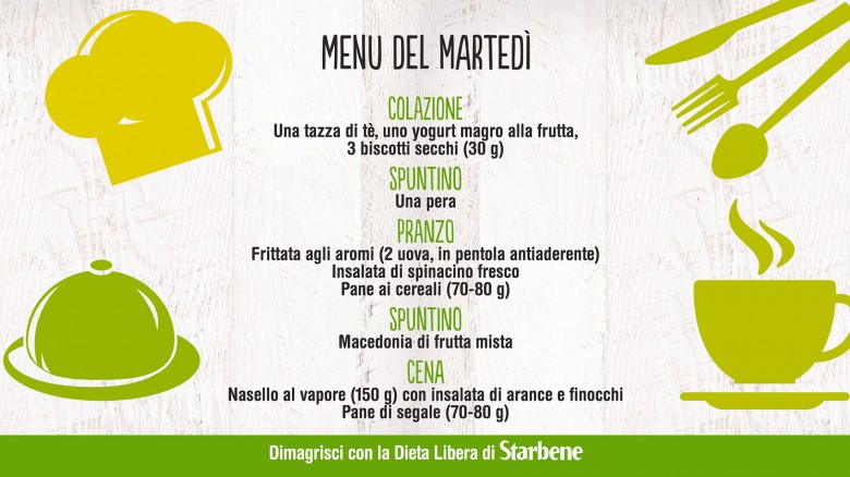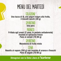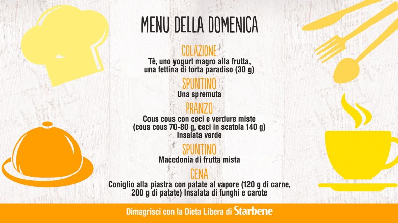 Con la Dieta Libera di Starbene mangi sano, senza patire la fame e senza grandi rinunce. Non ci sono alimenti vietati: puoi variare i menu in base ai tuoi gusti e alle tue esigenze. Non sai cosa mangiare? Sulla pagina Facebook di Starbene ti diamo ogni giorno un menu diverso, da circa 1400 calorie. Ecco qui cosa abbiamo proposto per la settimana dal 22 al 28 febbraio 2016.