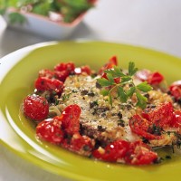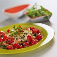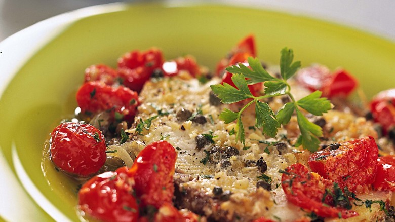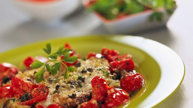 Pomodorini, capperi e cipolle per il mix mediterraneo del pesce spada alla messinese