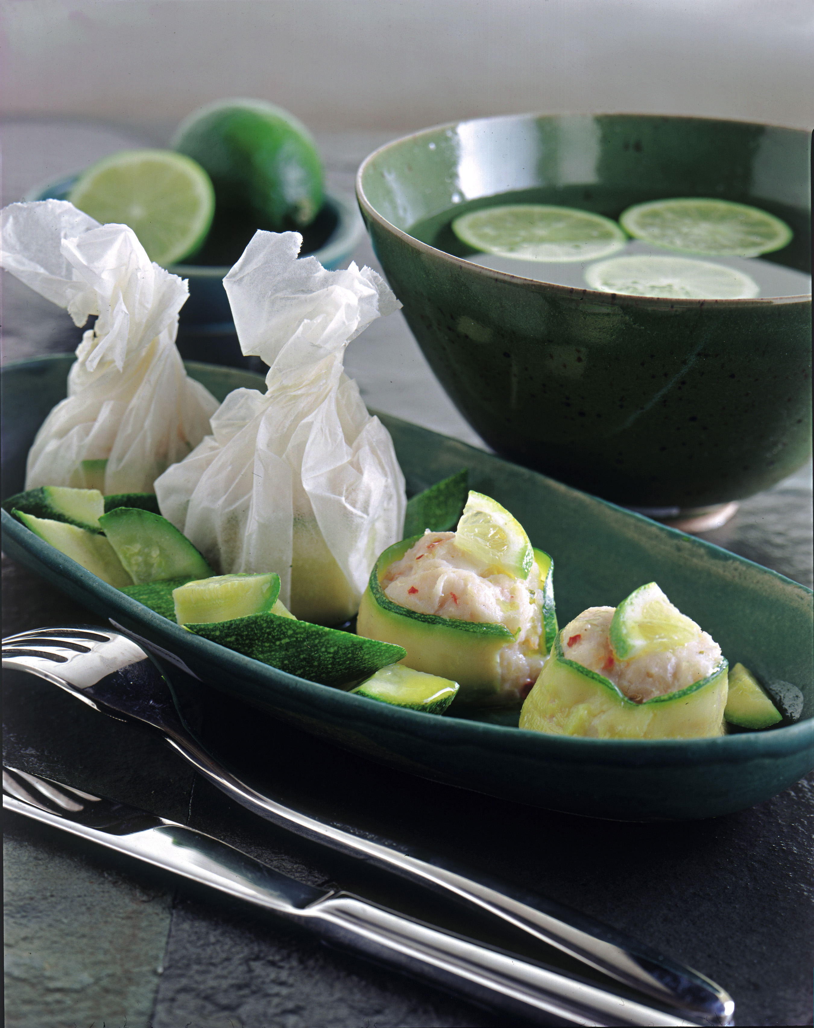 3) A cottura ultimata scarta i rotolini e sistemali nei piatti individuali accompagnandoli con qualche pezzetto di zucchina. Crea un’emulsione con olio, succo di lime e poco sale e utilizzala per condire il piatto. Se ti piace, decora con qualche fettina di lime o limone.