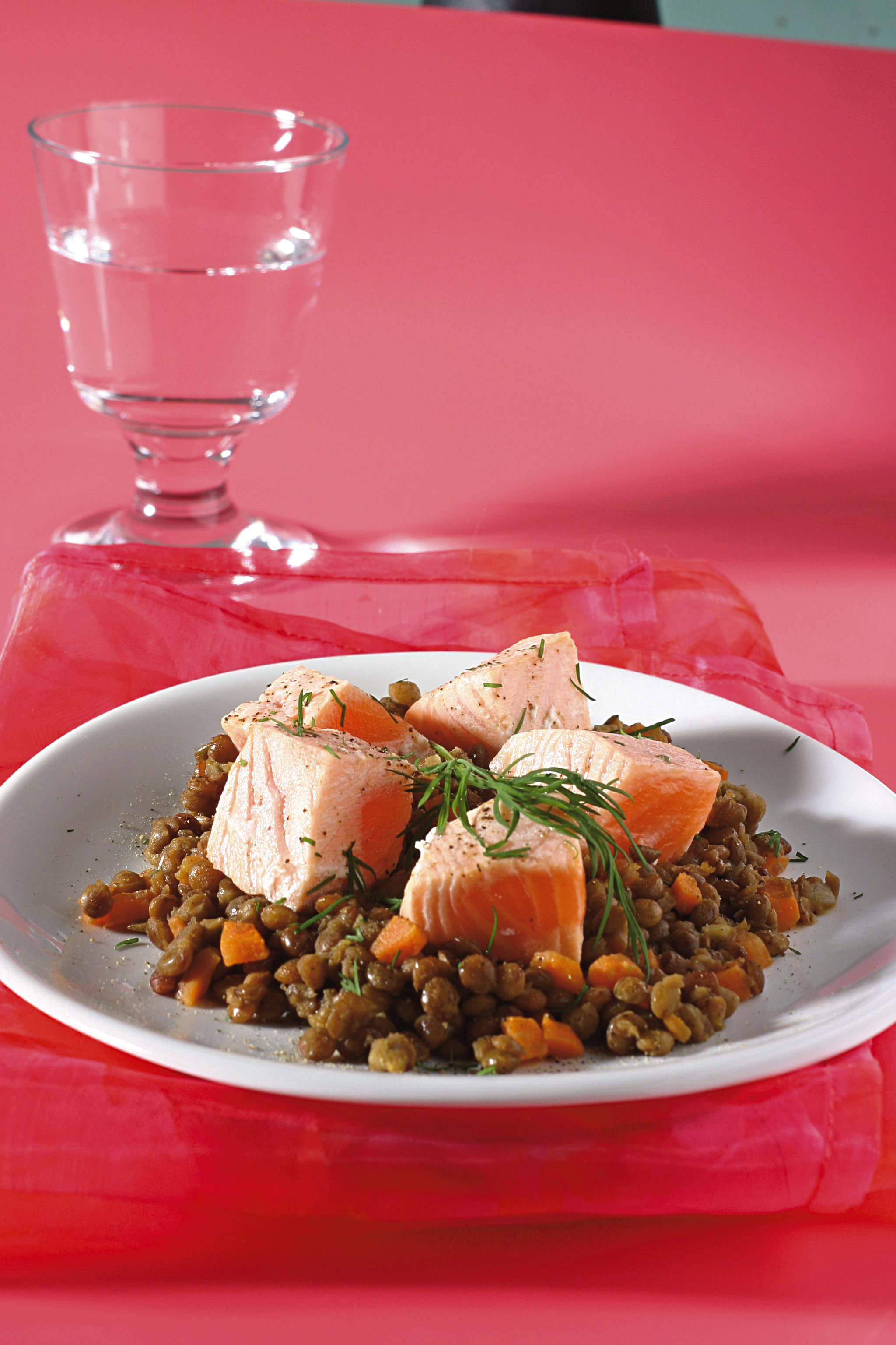 2) Nel frattempo spella il salmone fresco e taglialo a quadri. Non appena le lenticchiesaranno diventate morbide, mettici sopra il pesce e copri nuovamente con il coperchio. Lascia cuocere a fuoco basso per altri 4 o 5 minuti, poi spegni e cospargi il tutto con l’aneto fresco prima di servire.