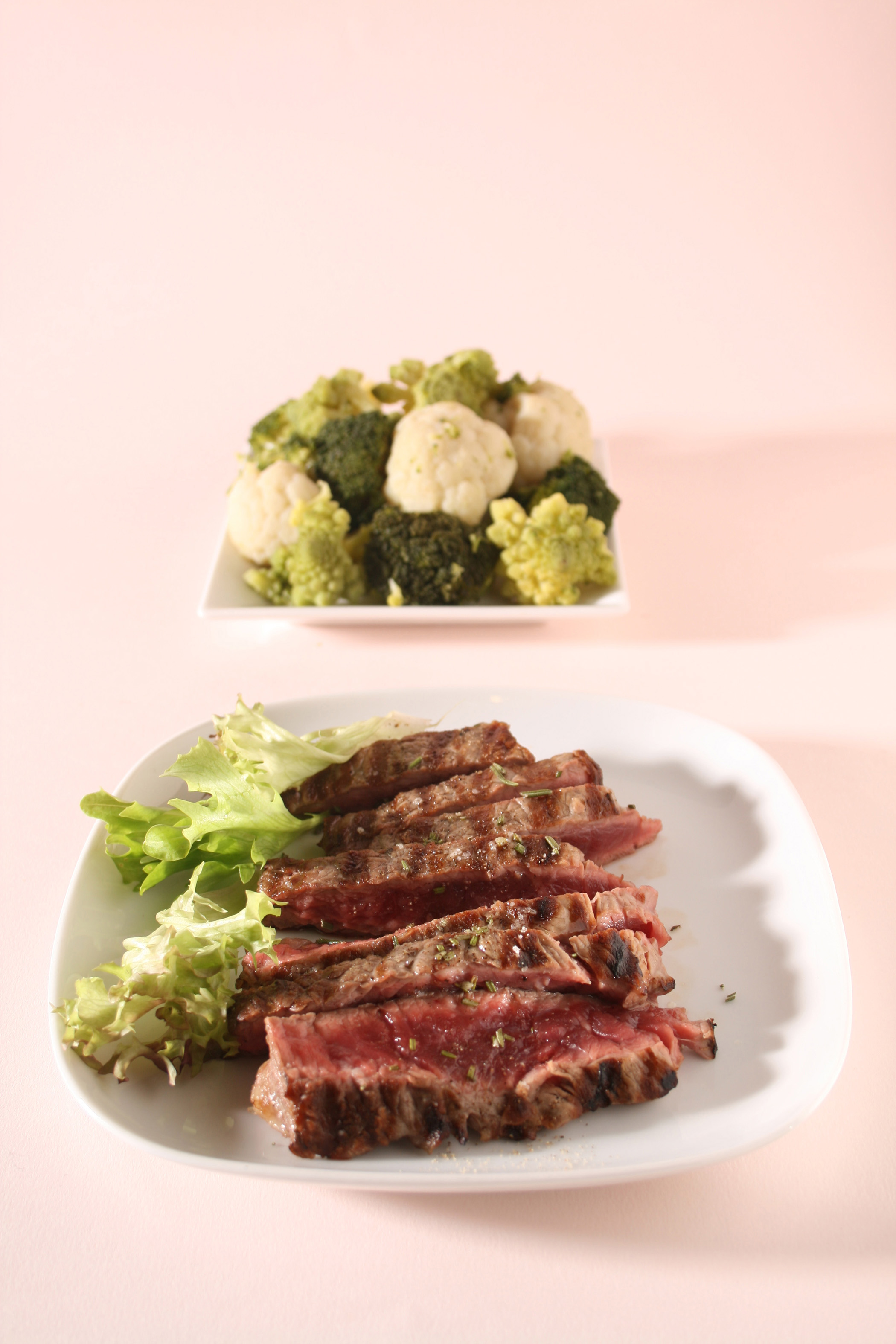 Pochi grassi e tanto gusto nella ricetta della tagliata alla brace, abbinata a cimette di cavolfiori o broccoli