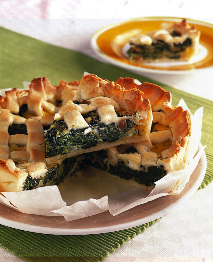 Per rendere completamente vegetariana la nostra torta con erbette basterà sostituire la pancetta affumicata con quella vegetariana, che può essere facilmente ottenuta marinando strisce di tempeh o tofu in svariate spezie che andranno poi fritte. Questa, diversamente dalla pancetta più classica, è ricca di proteine e fibre, povera di grassi e completamente priva di colesterolo.