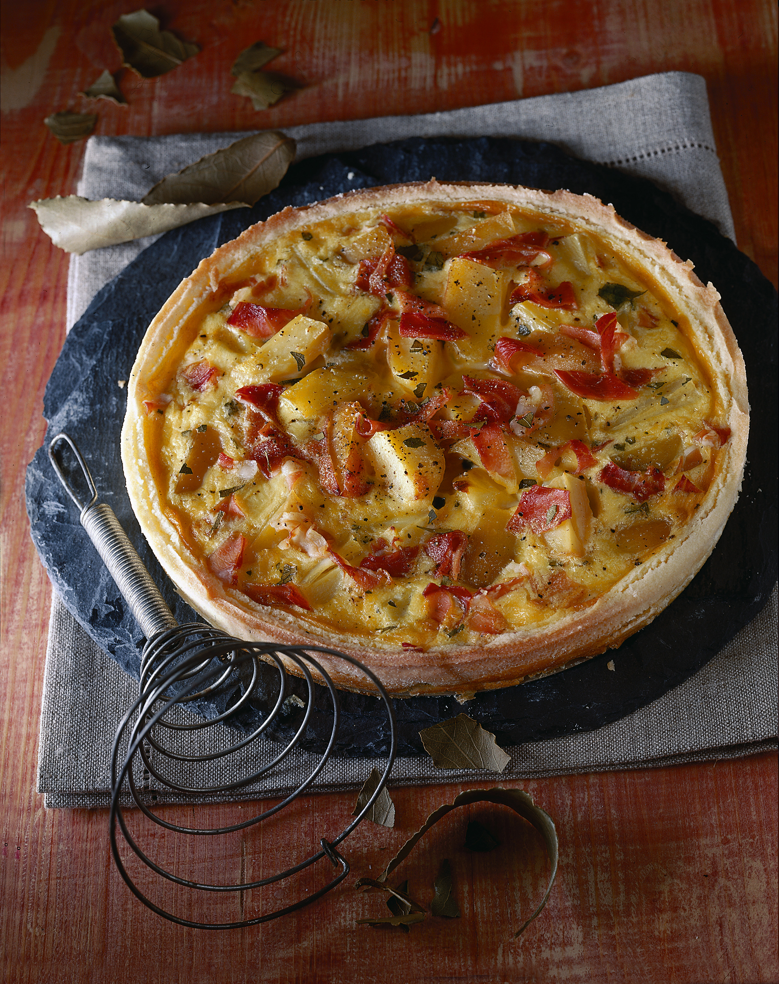 2) Fai lessare le patate, sbucciale e tagliale a spicchi piuttosto piccoli, poi distribuiscile sulla pasta brisée insieme allo speck tagliato a pezzetti. Dopodiché condisci con un po’ di sale aromatizzato alle erbe e la cipolla tritata.