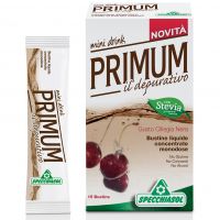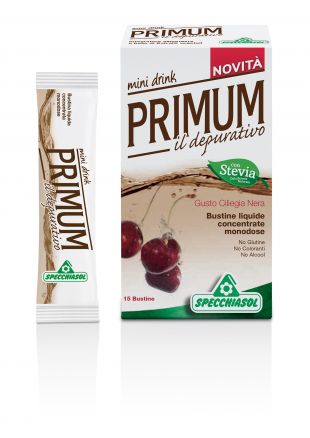 Il mini drink pocket Si diluisce una bustina in un bel bicchiere d’acqua e si assume la mattina a digiuno. Contiene succo concentrato di sambuco e il gusto è alla ciliegia nera. Primum Mini Drink il depurativo di Specchiasol (15,50 euro, 15 bustine da 10 ml).