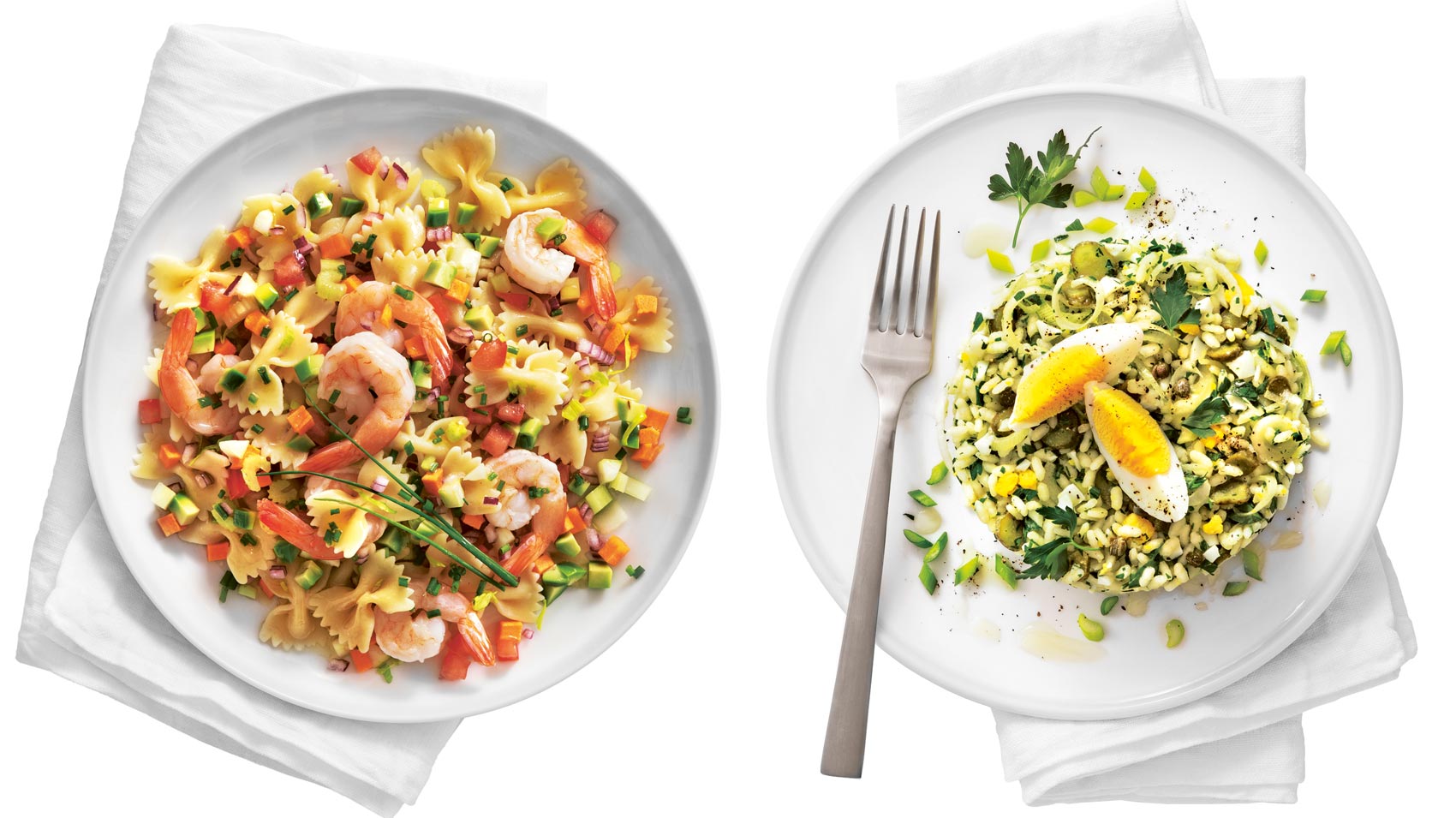 Farfalle con dadolata di verdure e gamberi e riso fresco al prezzemolo con uova sode. Ecco due ricette estive leggere e gustose. Il loro segreto? Sono preparate con cereali Le Stagioni d'Italia, a filiera corta e di altissima qualità