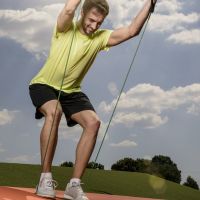 In stazione eretta, posiziona il centro della fascia sotto il tallone sinistro, sistemando il piede destro indietro, alla distanza di poco più di un passo e sulla stessa linea del sinistro.