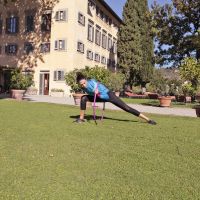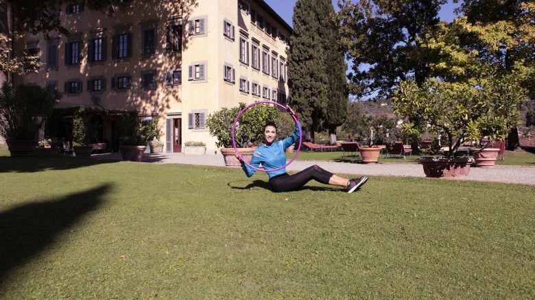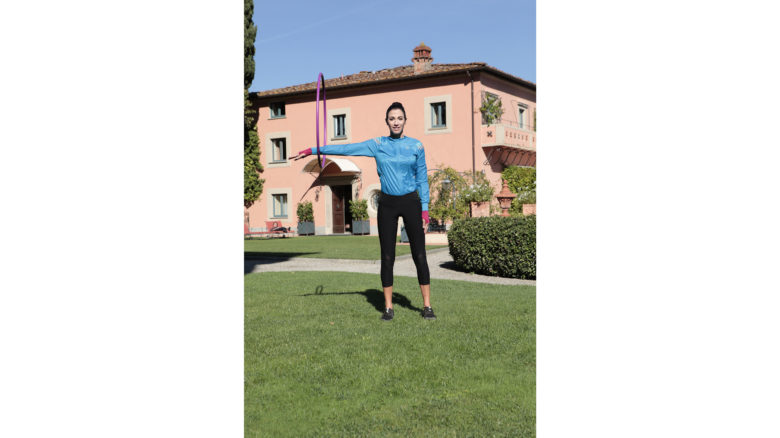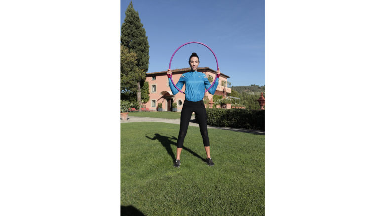 Mi sono molto divertita nell’eseguire questo workout studiato da Gianluca Zoppi, il personal trainer con cui mi alleno. Si basa su una serie di esercizi con l’hula hoop, il cerchio di plastica con cui spesso giocavo da bambina, provando e riprovando a farlo roteare intorno alla vita. Tornata a usarlo, ho verificato che può davvero trasformarsi in un attrezzo efficace per snellire pancia e fianchi, così come per un lavoro di tonificazione e per migliorare elasticità e coordinazione.