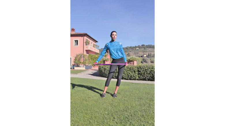 Per aiutarti, porta anche in alto le braccia, con i gomiti flessi, tenendole aperte di lato: ti daranno stabilità e non interferiranno con il movimento di rotazione dell’hula hoop.