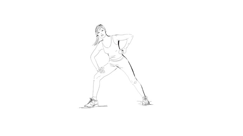 A gambe divaricate, fai un passo in avanti con la destra e piega il ginocchio (appoggiandoti con una mano); la sinistra si distende completamente, senza però irrigidirsi. Impugna con la mano libera un manubrio da 2 kg e lascia scendere il braccio in modo naturale verso terra.