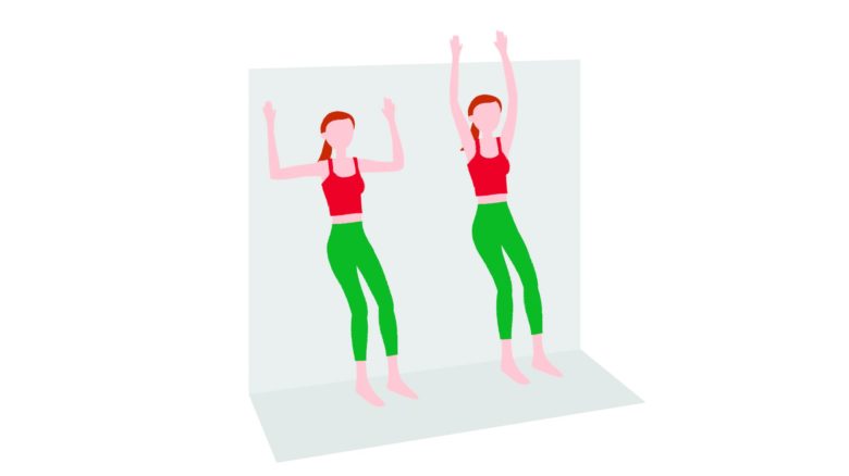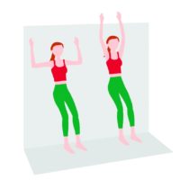 Spalle e zona lombare alla parete, con i piedi a 30 cm e distanti tra loro quanto il bacino, le gambe leggermente piegate, fletti i gomiti a 90° all’altezza delle spalle, con i palmi delle mani all’esterno. Espirando, distendi le braccia verso l’alto, allungandoti bene.