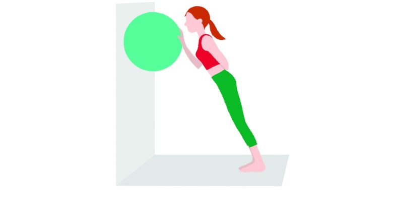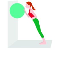 Posiziona alla parete, e all’altezza del volto, una fitball leggermente sgonfia, e tieni i piedi a circa 1 metro dal muro. Appoggia il palmo della mano destra alla palla, con il gomito flesso e aderente al busto. Il braccio sinistro è piegato, con l’avambraccio sotto le scapole.
