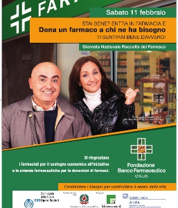 Torna sabato 11 febbraio in tutta Italia la 12° Giornata nazionale di raccolta del farmaco all'insegna dello slogan: "Dona un farmaco a chi ne ha bisogno. La carità ti cambia la vita". L'iniziativa, organizzata dalla Fondazione Banco farmaceutico Onlus in collaborazione con la Compagnia delle opere, si svolgerà in 3.500 farmacie distribuite in 85 province e oltre 1.200 comuni, e nello stesso giorno interesserà anche Spagna e Portogallo.