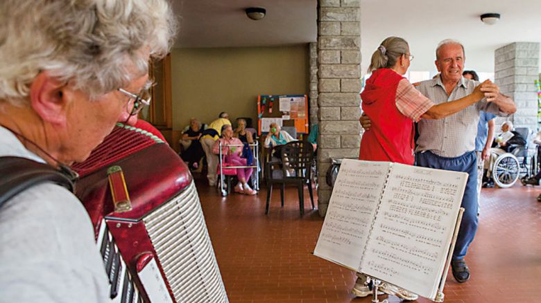 Racconta a riguardo Sandra Mirti, il cui marito ha fatto per dieci anni il ricovero diurno al Rifugio. «Ascoltare i cori degli alpini, insieme a tirare la pasta per i ravioli, era una delle sue attività preferite. Avendo fatto l’alpino in Friuli, la sua mente si risvegliava con le note e a volte riusciva a intonare qualche canzone dei tempi militari». La memoria, le canzoni della gioventù, la loro golden age... Alcuni, quelli più autosufficienti, riprendono persino a ballare nel grande salone chiamato Caffè Alzheimer. È un bar-ristorante dove ospiti, parenti, infermieri e operatori sanitari, che hanno dismesso il camice bianco, si ritrovano una domenica al mese per pranzare insieme e fare quattro salti, con l’orchestra che suona dal vivo.