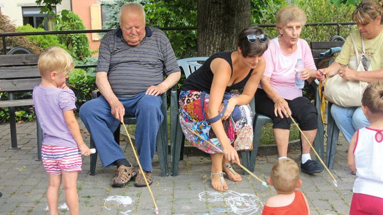 Entrando nel cortile centrale, c’è una sorpresa: mi aspetto di vedere solo teste bianche, bastoni e carrozzelle. Invece, vengo quasi travolta da bambini piccoli che giocano e corrono da tutte le parti. «Fa parte del progetto», mi spiega Marcello Galetti, direttore della struttura. «Portiamo spesso i nostri ospiti all’asilo nido di Monte Pellice, oggi invece sono venuti a trovarci i bambini. È un momento di incontro che fa bene a grandi e piccini. Diamo a tutti la possibilità di sentirsi nonni, anche se non hanno nipoti. E senza suggerire nulla, vediamo che le modalità di interazione sono infinite: c’è chi racconta una favola o i propri ricordi infantili, e chi fa trotterellare i bimbi sulle ginocchia rispolverando filastrocche dimenticate».