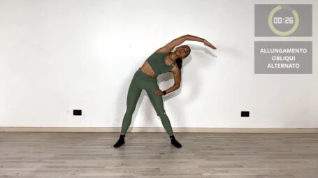 Primo esercizio: attivazione addominale. Si effettua quindi un'estensione dolce, per cimentarsi poi con il side plank. In chiusura, piegamenti a colonna dritta, con l'aiuto di un bastone che ci consentirà di fare forza sulle anche e non sulla colonna.